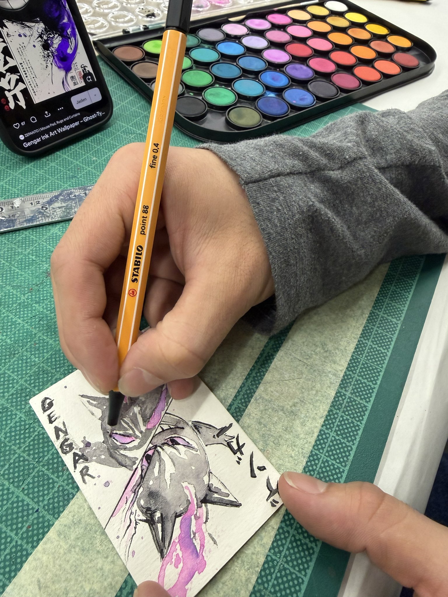 Wir bringen unsere eigenen Manga und andere Comics-Zeichnungen mit und pausen diese auf Aquarellpapier durch. Dabei experimentieren wir mit verschiedenen Techniken der Aquarell Malerei, um unseren Zeichnungen Leben einzuhauchen.